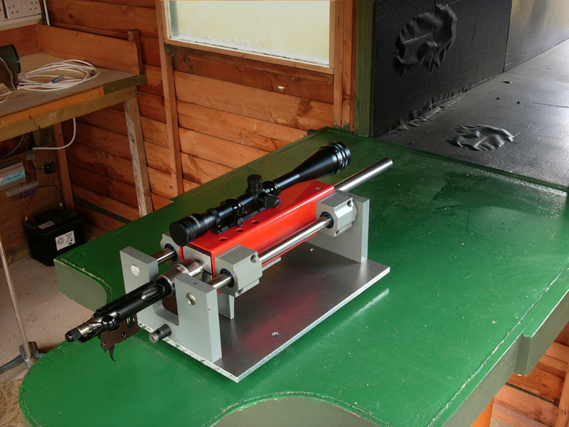 Initial groups with Tenex WP439 using the reference barrel BB01 (bore .217", groove .222", 6 grooves, 16" twist, 26" long, SAAMI Match chamber, 0.041" headspace) in the test rig produced an average ESEE (Extreme Spread Edge to Edge) of around 13.5mm at a range of 50 metres. WP439 dates from the early 1990s and was the ammunition used to test rimfire rifles that we were rebarrelling at that time. Our acceptance criterion was that the rifle should be able to shoot 12mm ESEE groups at 50 metres when using the WP439 ammunition, and while the average group from barrel BB01 was a little larger than this, there were a number of groups less than 12mm ESEE. WP439 had been considered "one of the best batches of Tenex ever made" at the time and shot well in almost any rifle. By contrast, the new 'flat nosed' Tenex batch 1055, dating from this year (2010), shot considerably worse than this out of reference barrel BB01 producing around 15.5mm ESEE. These groups were disappointing. The test rig had been built to be a rigid 'barrel vice', but it was plain that bottom plate flexed due to the recoil force. When looking through the scope (attached to the top of the barrel clamp) the picture would 'jump' noticeably when the rifle was fired.